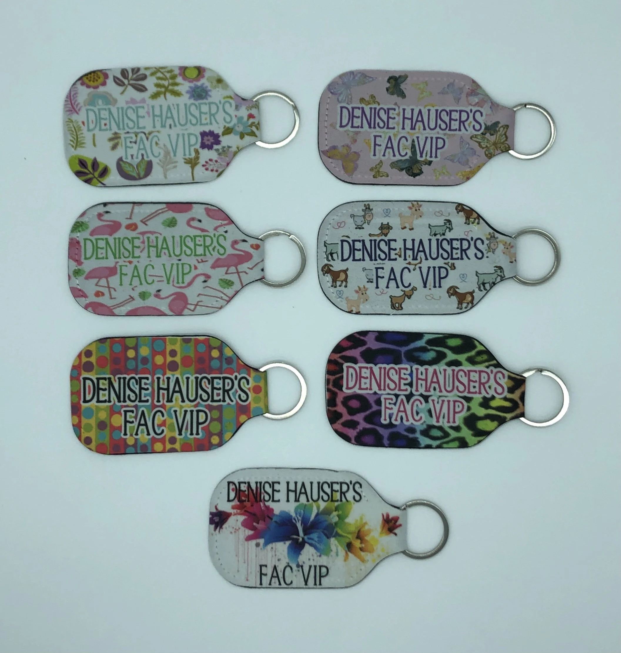 Neoprene, washer and dryer friendly hand sanitizer keychains. container holds 2.5oz of sanitizer. Fully customizable on both sides.